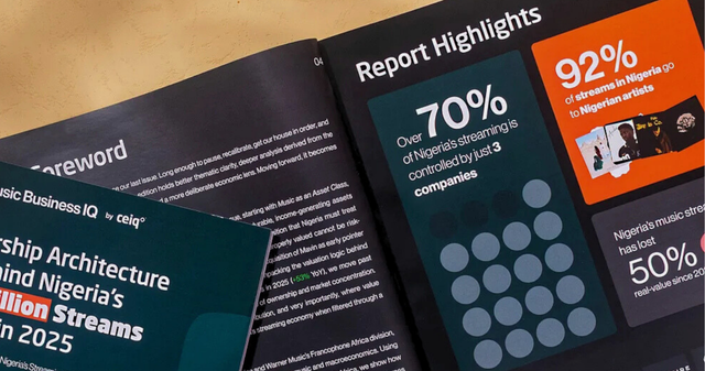 The report found that while Nigeria’s music ecosystem appears fragmented at the downstream level among many primary labels and imprints, it shrinks considerably moving upstream. Just three companies control approximately 75 percent of Nigeria’s streaming market across major DSPs at the parent entity level.